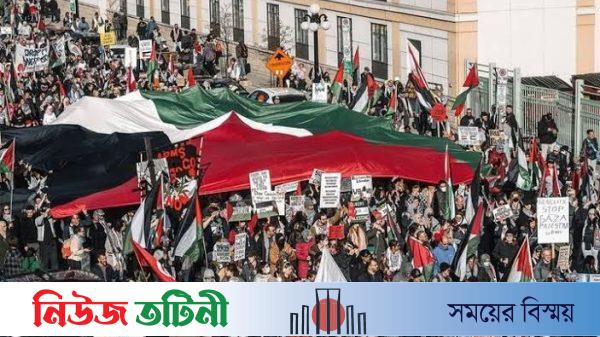 সোশ্যাল মিডিয়ায় শেয়ার করা ভিডিওতে দেখা যায়— গতকাল শনিবার ফিলিস্তিনি পতাকা উড়িয়ে এবং বিভিন্ন ব্যানার নিয়ে রাজপথে নেমে আসে শত শত মানুষ। এ সময় ‘এখনই যুদ্ধবিরতি চাই’-এর মতো স্লোগানও দেন তারা।